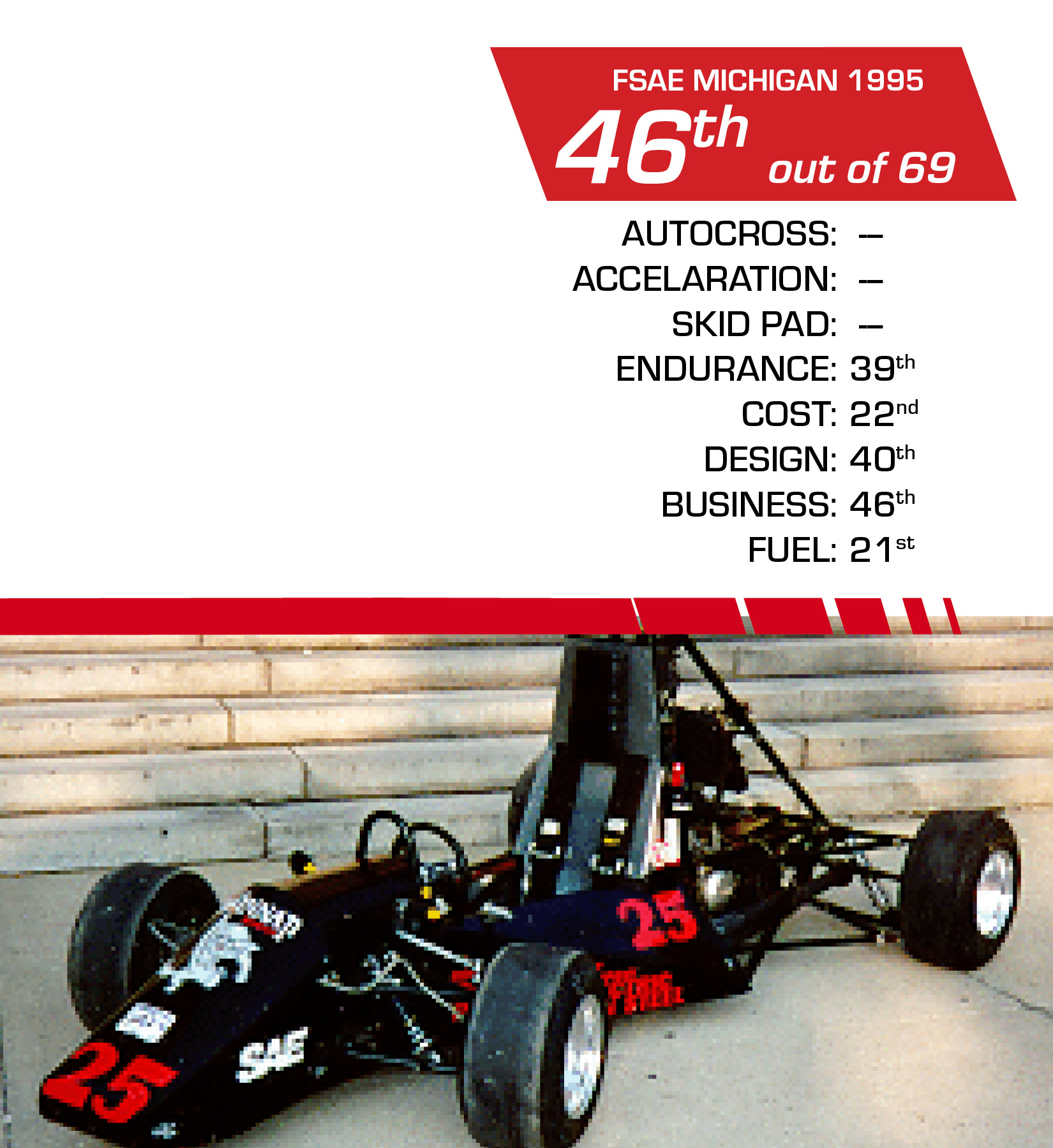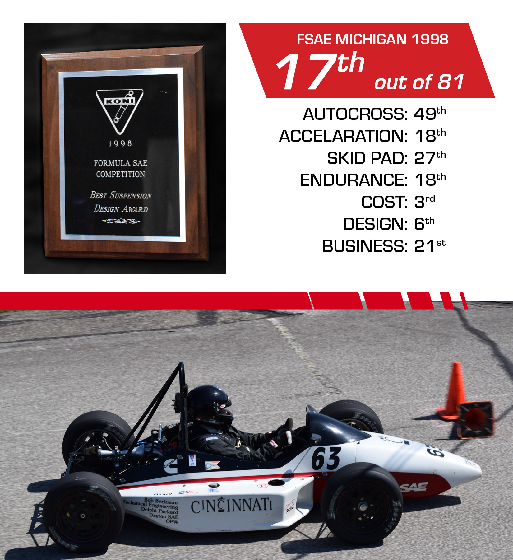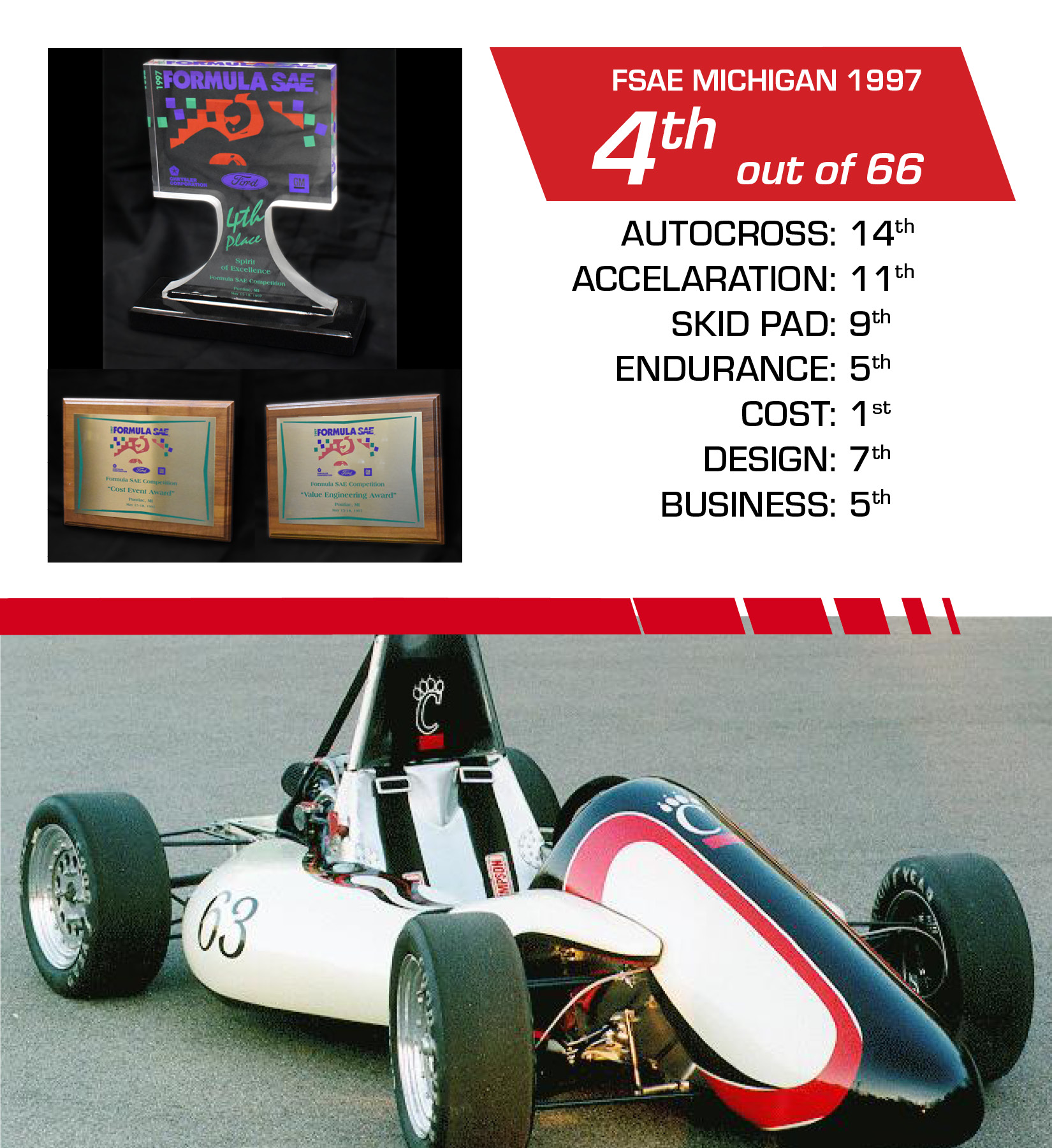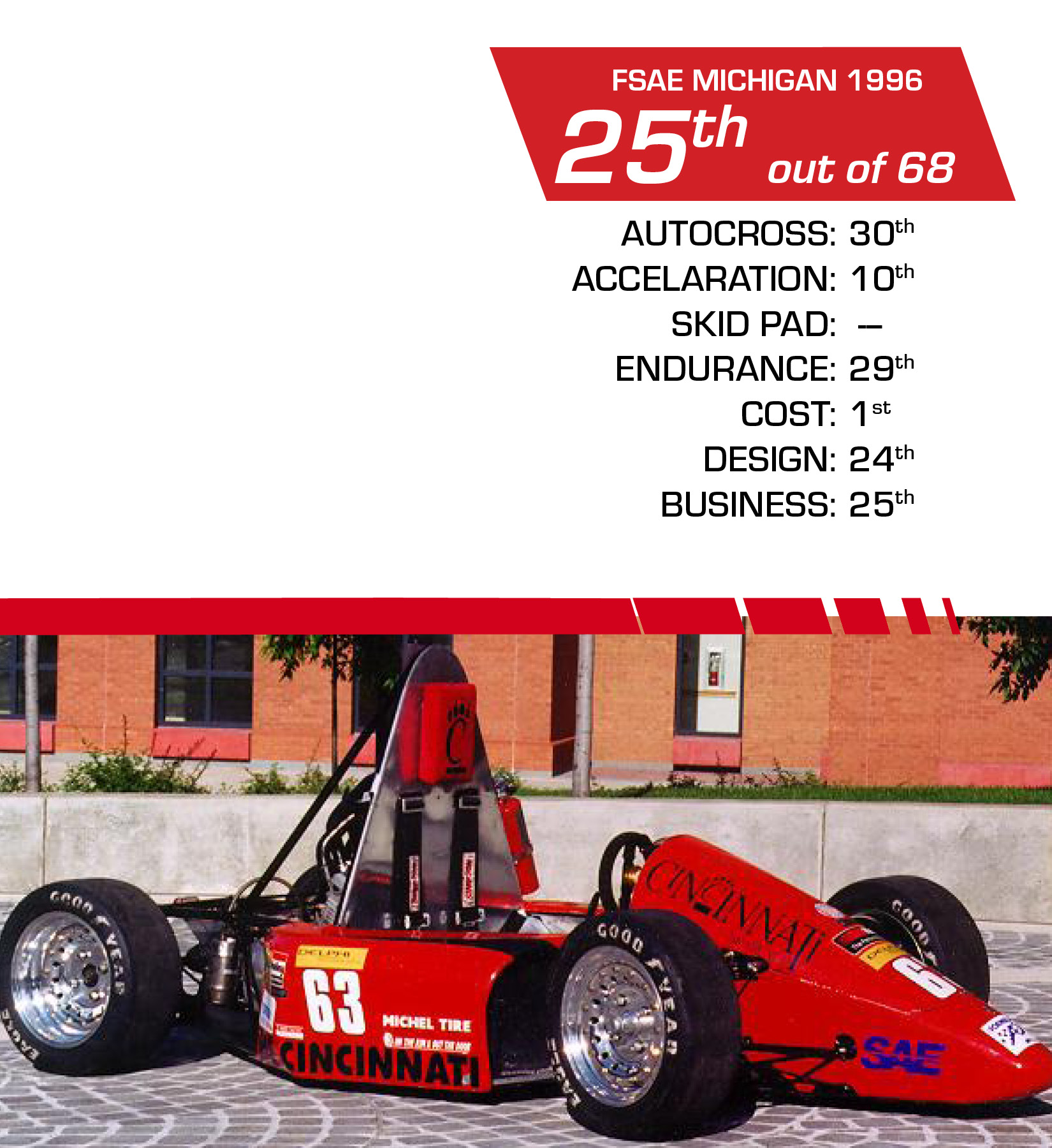 We are lucky to have started before FSAE was around and attended the first competiton but unfortunately, we don't have any documentation accessible to students currently on the team. If you know any results or have images not listed, please feel free to send them our way! (bcms@ucmail.uc.edu)