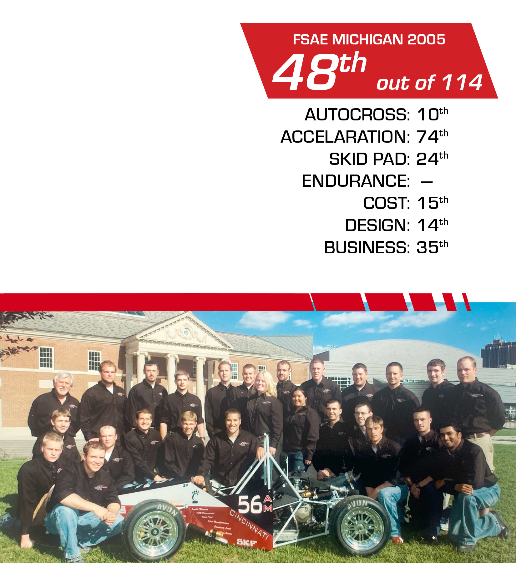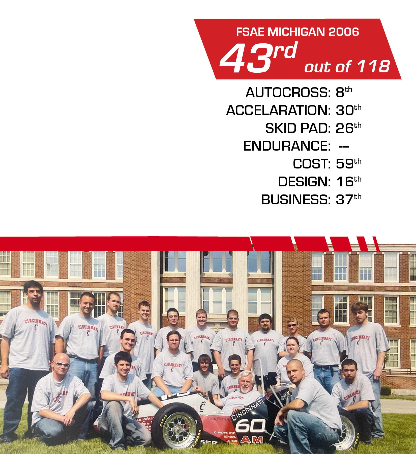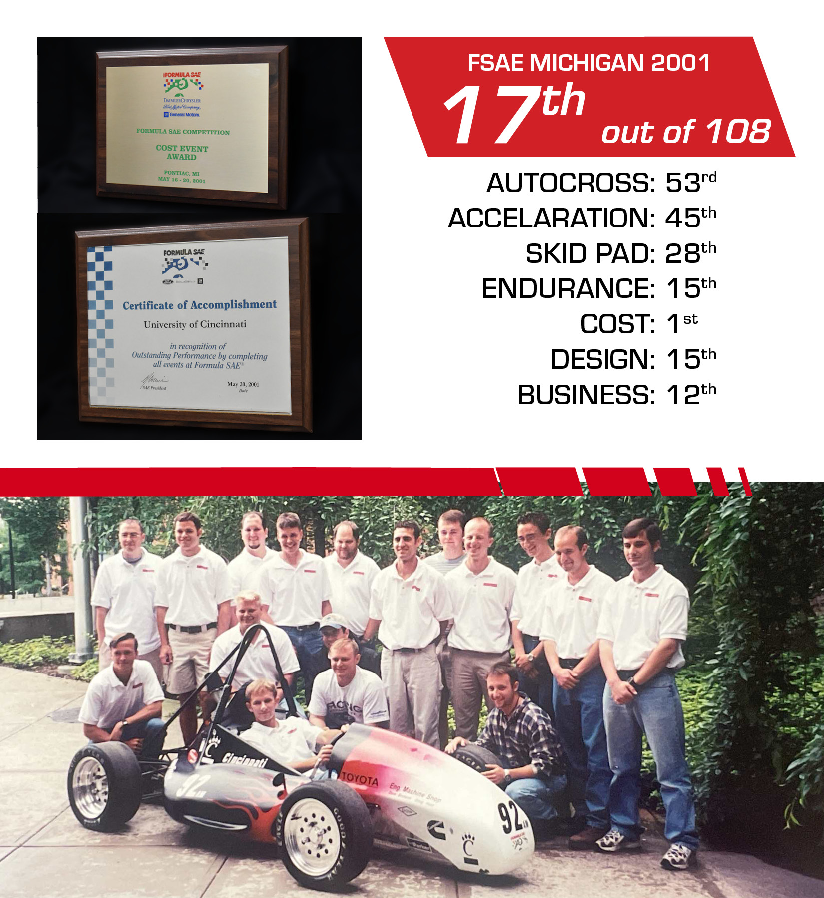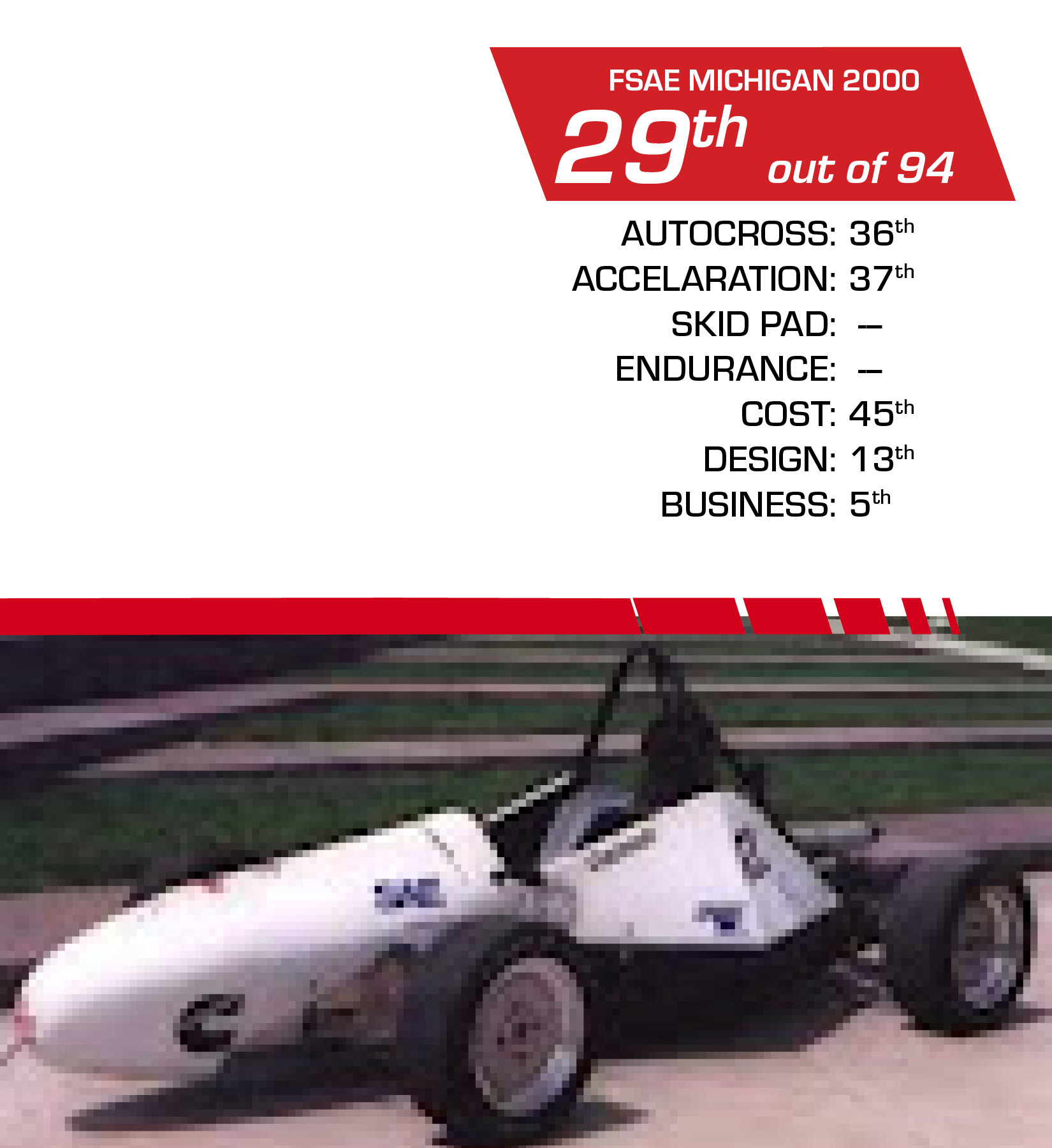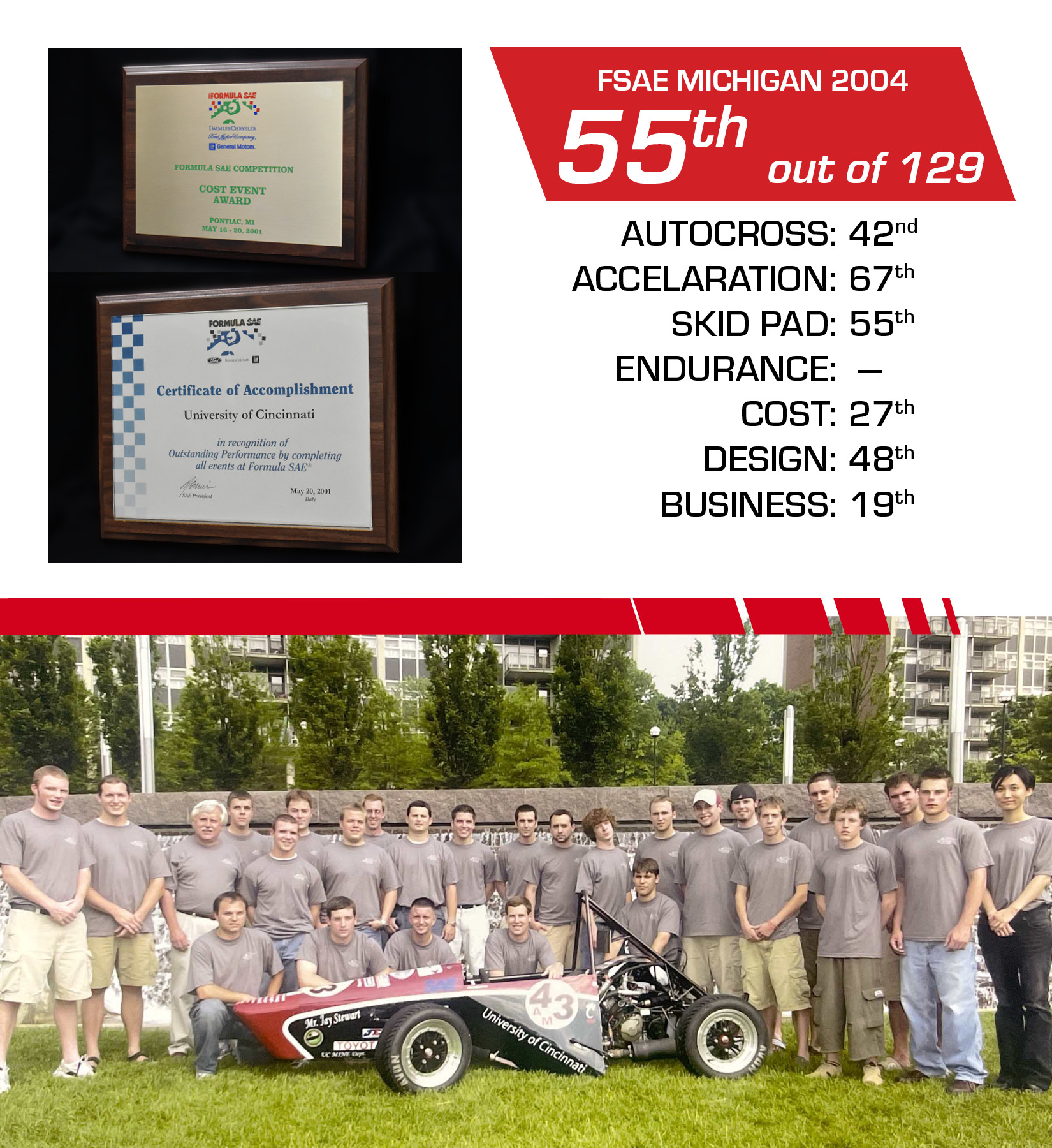 We are lucky to have started before FSAE was around and attended the first competiton but unfortunately, we don't have any documentation accessible to students currently on the team. If you know any results or have images not listed, please feel free to send them our way! (bcms@ucmail.uc.edu)